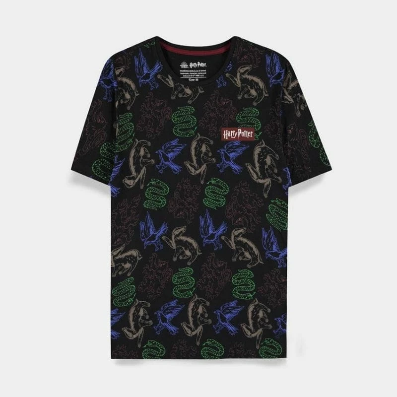 Splash some colour into your next outfit with this magical official Harry Potter t-shirt showcasing a trendy all-over-print design with each Hogwarts house emblem in their signature colour.