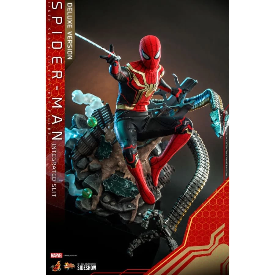 Our friendly neighborhood hero is unmasked and no longer able to separate his normal life from the high stakes of being a superhero. When he asks for help from Doctor Strange, the stakes become even more dangerous, forcing him to discover what it truly means to be Spider-Man. Hot Toys are presenting the Spider-Man (Integrated Suit) Deluxe Version Sixth Scale Collectible Figure from the Spider-Man: No Way Home collection. Masterfully crafted based on Spider-Man/Peter Parkerβs appearance portrayed by Tom Holland in the movie, the highly-accurate figure features a newly painted head sculpt of Peter Parker, a masked head sculpt with multiple pairs of interchangeable Spider-Man eye pieces to create numerous Spider-Manβs expressions; a finely tailored red, black Integrated Suit with gold accents and web pattern; articulated pincers; web wings; an array of amazing accessories including Spider-Man mask, smartphone and assorted spider-web shooting effect parts. The Deluxe Version will exclusively include a newly developed half masked Peter Parker head sculpt, and a battlefield-themed diorama figure base with elements of Spider-Manβs foe including Green Goblin, and Dr. Ockβs bendable tentacles with articulated claws wrapping around.