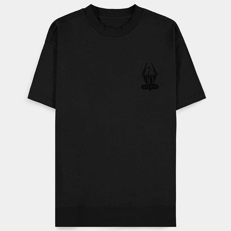 Freely roam over Skyrimβs unique environment in this stylish t-shirt which celebrates its 10th anniversary. This black t-shirt has a loose fit, wider collar-including ribbed neck tape, ribbed hem with side slits and eye-catching shiny tonal foil printed designs on the chest and back.