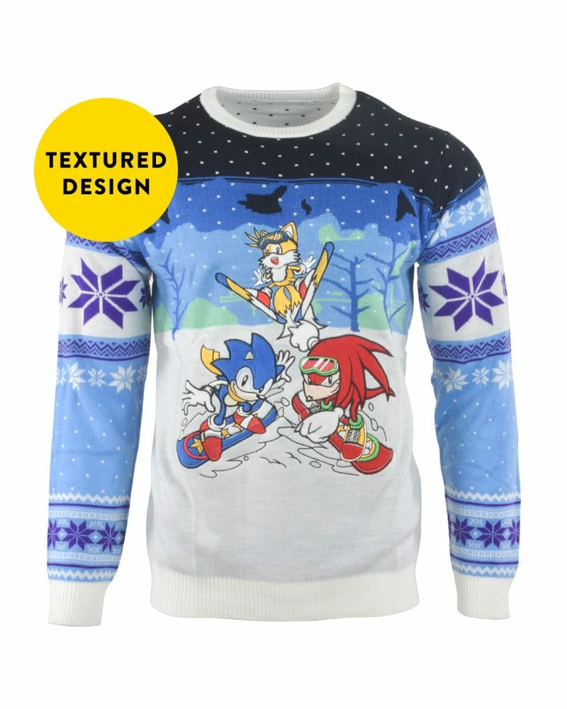Sonic and friends look super cool at the best of times, but when theyβre all dressed up warm and ready for the winter, theyβre at their best! This official Sonic the Hedgehog Xmas jumper features Sonic, Knuckles, and Tails on snowboards and skis on a very festive, knitted βuglyβ sweater. If youβre a fan of Sonic, this is the Christmas wear for you!